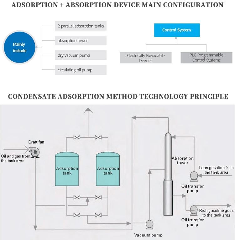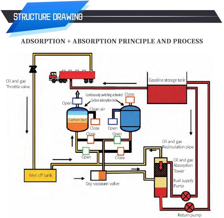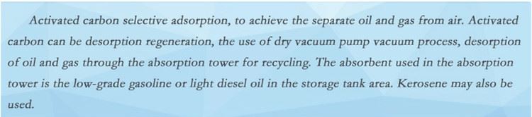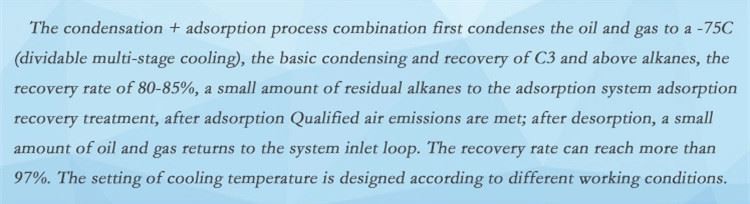 Gőzvisszanyerő egység a kőolajfinomító számára. A feldolgozó torony csatlakozik a tartály szellőző rendszeréhez. Az egységet csúszósínre szerelik, teljesen gyárilag összeszerelve, a szállítás előtt tesztelik, és minden szükséges felszerelést tartalmaz, beleértve a műszereket, a csöveket és az elektromos alkatrészeket. A kezelés egyszerű - egyetlen kapcsoló aktiválja az egység automatikus indítását, működését és leállítását.